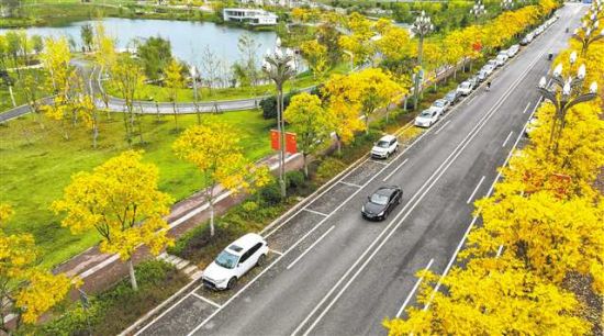 11月10日,垫江县桂溪街道片区,公路两侧行道树树叶由青转黄,令人赏心悦目,成为一道独特的城市风景线(无人机照片)。