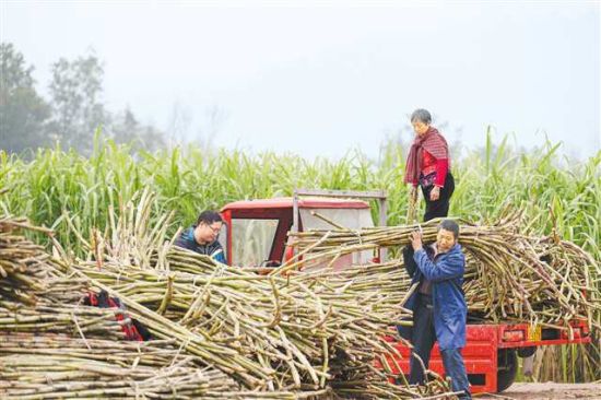 12月2日,开州区南门镇万里村,农民将集中砍收的甘蔗运出田地。