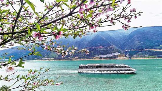 3月27日,巫山县境内,游轮航行在桃花映衬下的长江三峡巫峡水域。