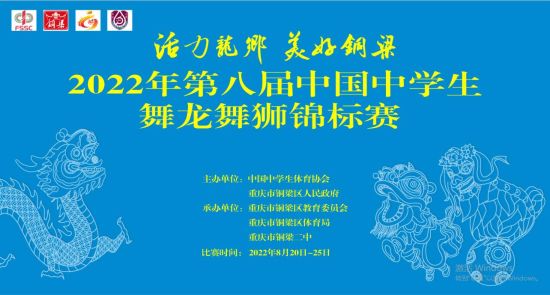 中新网重庆新闻8月21日电(马佳欣)8月21日(星期日)19:30,第八届中国中学生舞龙舞狮锦标赛将在铜梁区金龙体育馆举行。 本次大赛由中国中学生体育协会、重庆市铜梁区人民政府共同主办,铜梁区教委、铜梁区体育局、铜梁二中承办。根据最新新冠肺炎疫情形势和防控政策,第八届中国中学生舞龙舞狮锦标赛由线下比赛方式改为线上比赛方式进行。 中国新闻网客户端将对开幕式进行全程直播。来自全国各省市的25支参赛代表队,也将和大家一同见证此次大赛的开启,敬请期待!