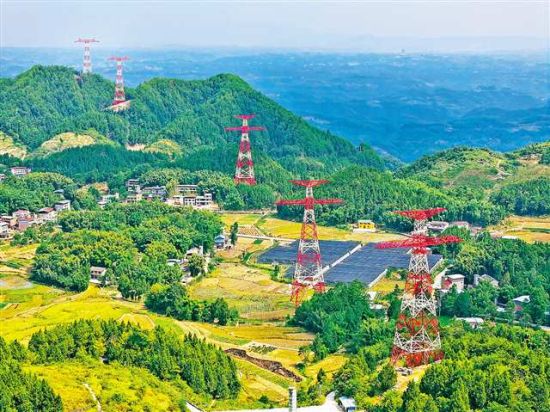 9月7日,梁平区,金上—湖北±800千伏特高压直流输电工程铁塔完成放线作业。