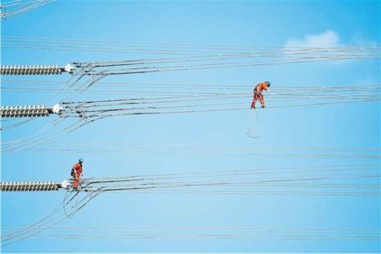近日,巴南区石泉路,220千伏巴四南北线、巴金北、巴走线电力线路迁改工程现场,电力工人从高压线塔走出。