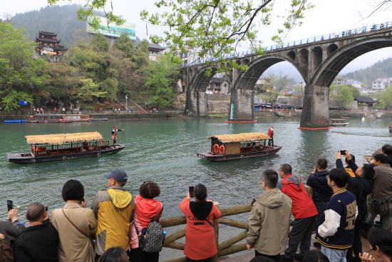 清水江畔春水融融,老街古建古韵盎然。3月25日,沉浸式情景剧《遇见边城》在重庆市秀山土家族苗族自治县洪安镇上演。游客沿滨水步道漫步洪茶古渡,感受“书中边城”人文底蕴与民俗文化魅力。据悉,近年来,该县深挖沈从文笔下《边城》原型文化内涵,融合渝湘黔少数民族民俗特色,打造边城风情小镇、《遇见边城》沉式情景剧,常态化开展非遗民俗展演,以文旅融合助推乡村振兴、激活文旅消费。图为人们在洪安镇老街观看沉浸式情景剧。胡程 摄