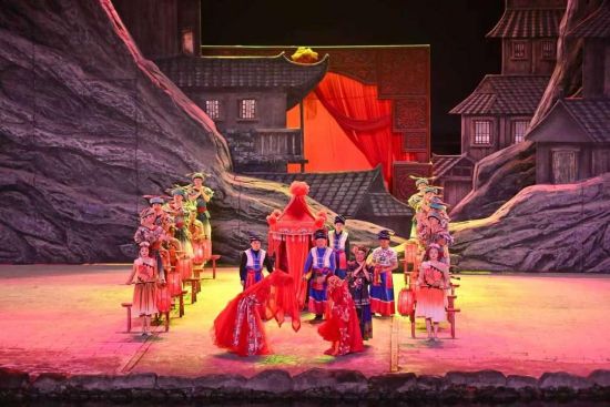 演出分成了好几幕,每一幕都透着烟火气:这边是《田园打击乐》,演员们拿着农具敲敲打打,把春耕秋收的节奏敲进了骨子里;那边是《哭嫁》,土家姑娘出嫁前哭得稀里哗啦,一群年轻人趴在洞房窗外嬉笑着“听墙根”,把土家人那种既不舍又欢喜的婚俗演得活灵活现。